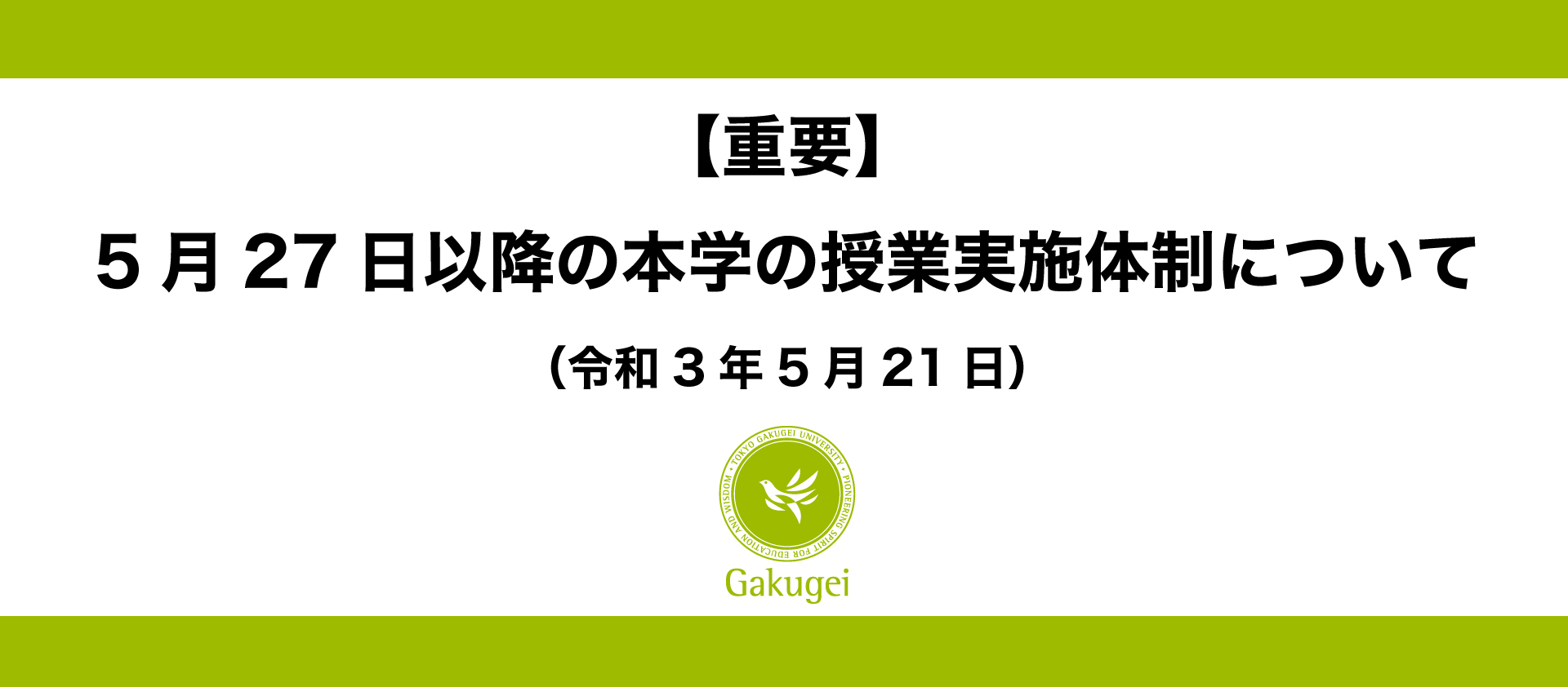 新型コロナウイルス感染症対応のための緊急事態宣言発出に伴い、本学では、令和3年4月23日付で、5月26日までの授業については、オンラインを基本とすることを通知しました。5月27日(木)以降の対応について、以下のようにお伝えします。