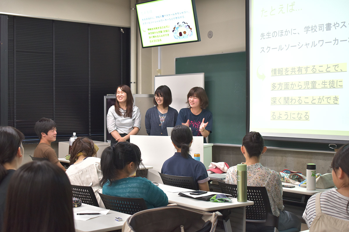 これは東京学芸大学の多くの科で一年時に必修となる入門セミナーの授業です。この授業では半年をかけて生涯学習コース全過程を通して必要な知識、力を身に着けます。今回はその最終プレゼンの様子を取材させていただきました。